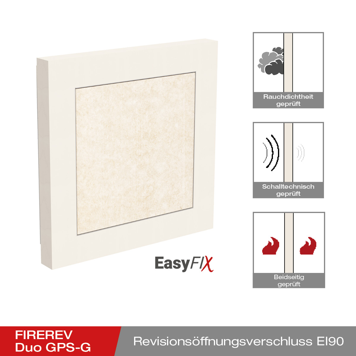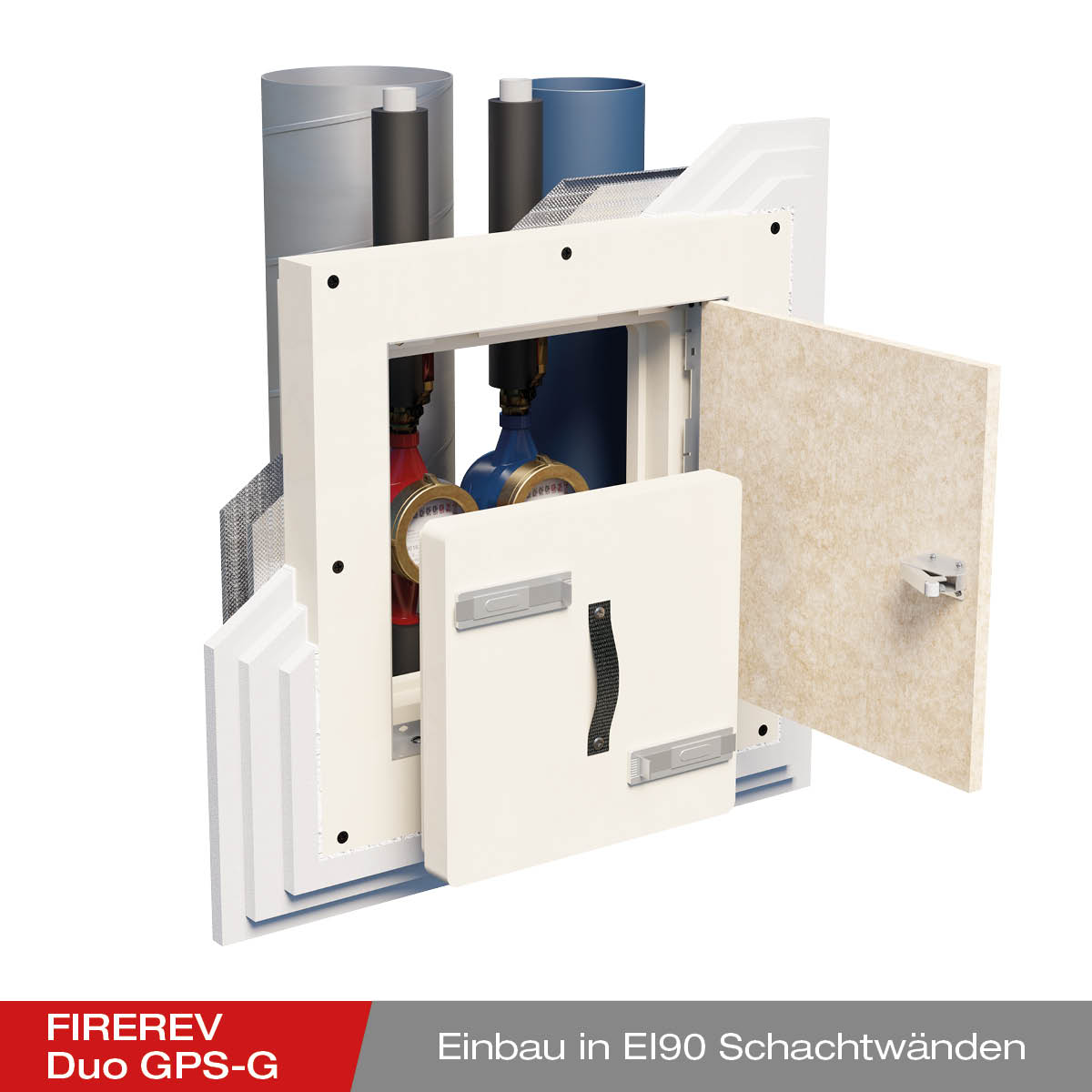 Le volet d'accès FIREREV Duo GPS-G sert d'ouverture de service dans les murs pour permettre l'entretien et l'inspection des installations. Il préserve en même temps les propriétés de protection contre l'incendie et d'isolation acoustique du mur.